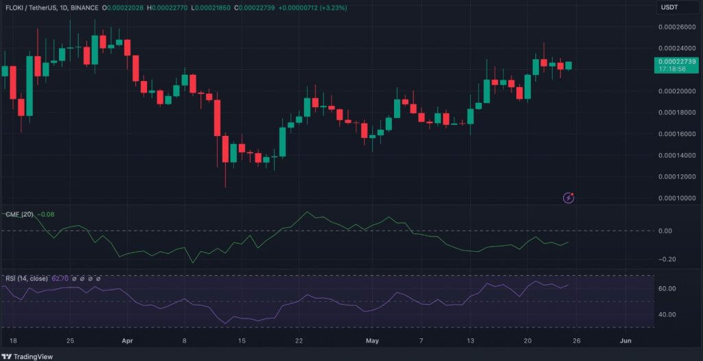 Desalniettemin bleven de marktindicatoren bullish. Bijvoorbeeld, de Chaikin Money Flow (CMF) registreerde een stijging. De Relative Strength Index (RSI) ging ook omhoog, wat aangeeft dat de kans groot is dat FLOKI zijn rally voortzet.