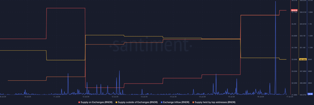 Aangezien de wallet activiteit van de token toenam, bekeken we het gedrag van investeerders. Onze analyse van Santiment gegevens onthulde dat whales RNDR aan het inslaan waren, aangezien de hoeveelheid tokens in handen van de grootste wallets sterk toenam.