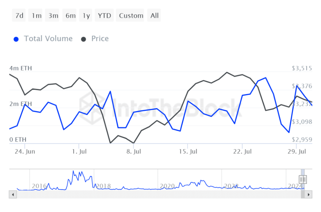Naast de ophoping door whales is er ook een toename in activiteit op beurzen. Grote platforms toonden een stijging in ETH handelsvolumes, volgens gegevens van IntoTheBlock.
