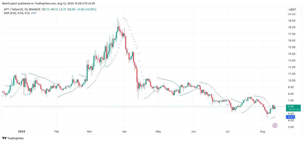 Daarnaast biedt de Parabolic Stop and Reverse (SAR) verder bewijs van een bullish trend. De positie van de punten onder de huidige prijs van Aptos geeft aan dat de markt zich in een opwaartse beweging bevindt, wat positieve koopactiviteit suggereert.