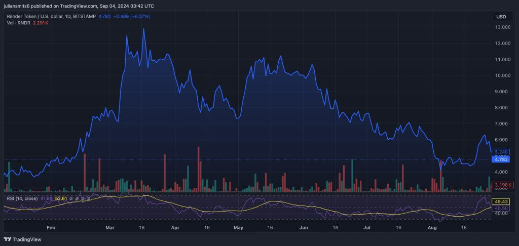 De Relative Strength Index (RSI) van RENDER laat zien dat de bulls momentum aan het opbouwen zijn voor een mogelijke doorbraak van het weerstandsniveau van $5,1 in de komende weken. Echter, door de volatiliteit in de markt blijft de toekomst van de altcoin onzeker.