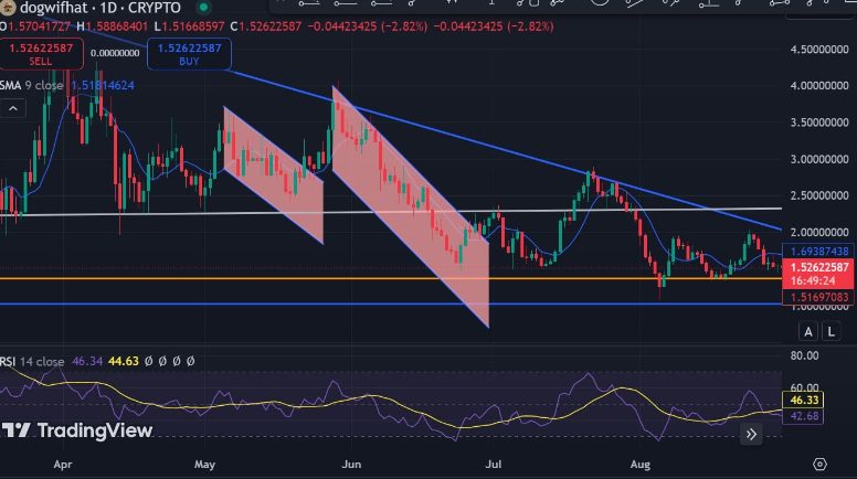 Op het moment van schrijven werd Dogwifhat verhandeld op $1,54, wat een stijging van net meer dan 9% over de afgelopen week betekent. Voorafgaand hieraan zat WIF in een dalende trend, met een daling van 15% over de afgelopen maand.