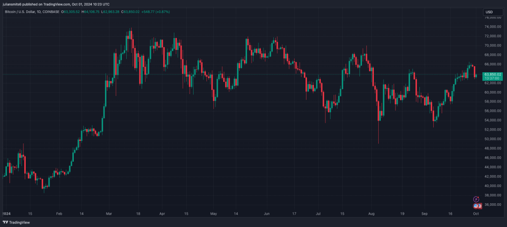 Toen oktober begon, zakte de prijs van BTC onder de $63.000, maar herstelde zich snel naar net onder de $64.000. De totale marktkapitalisatie van BTC daalde tot $1.263 biljoen, terwijl zijn dominantie over de altcoins afnam tot 53,4%.