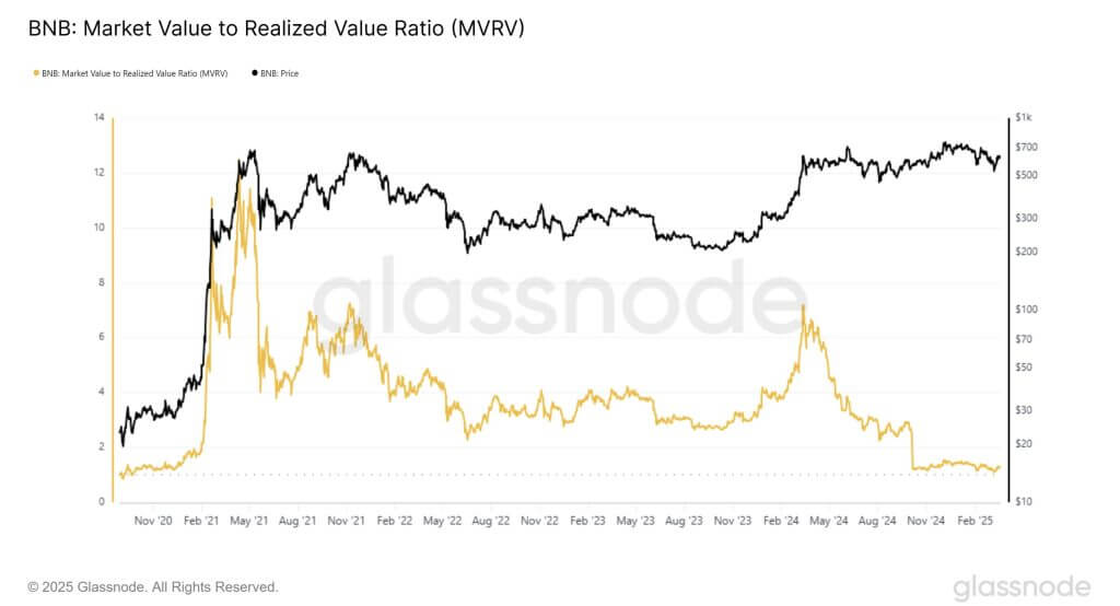 Toch lijkt BNB niet te zijn begonnen aan een lange termijn downtrend. De recente daling in de NUPL waarde kan wijzen op het vormen van een lokale bodem. De MVRV ratio schommelt sinds oktober 2024 rond het niveau van 1,20. Zelfs de gestage winst tot december duwde deze niet verder omhoog.