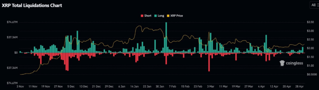 Op 30 april zag XRP een $13,90 miljoen aan long liquidaties tegenover slechts $1,50 miljoen aan short liquidaties, volgens CoinGlass (een 1000% disbalans). Dit contract wijst op een gevaarlijk over geïnvesteerde long bias.