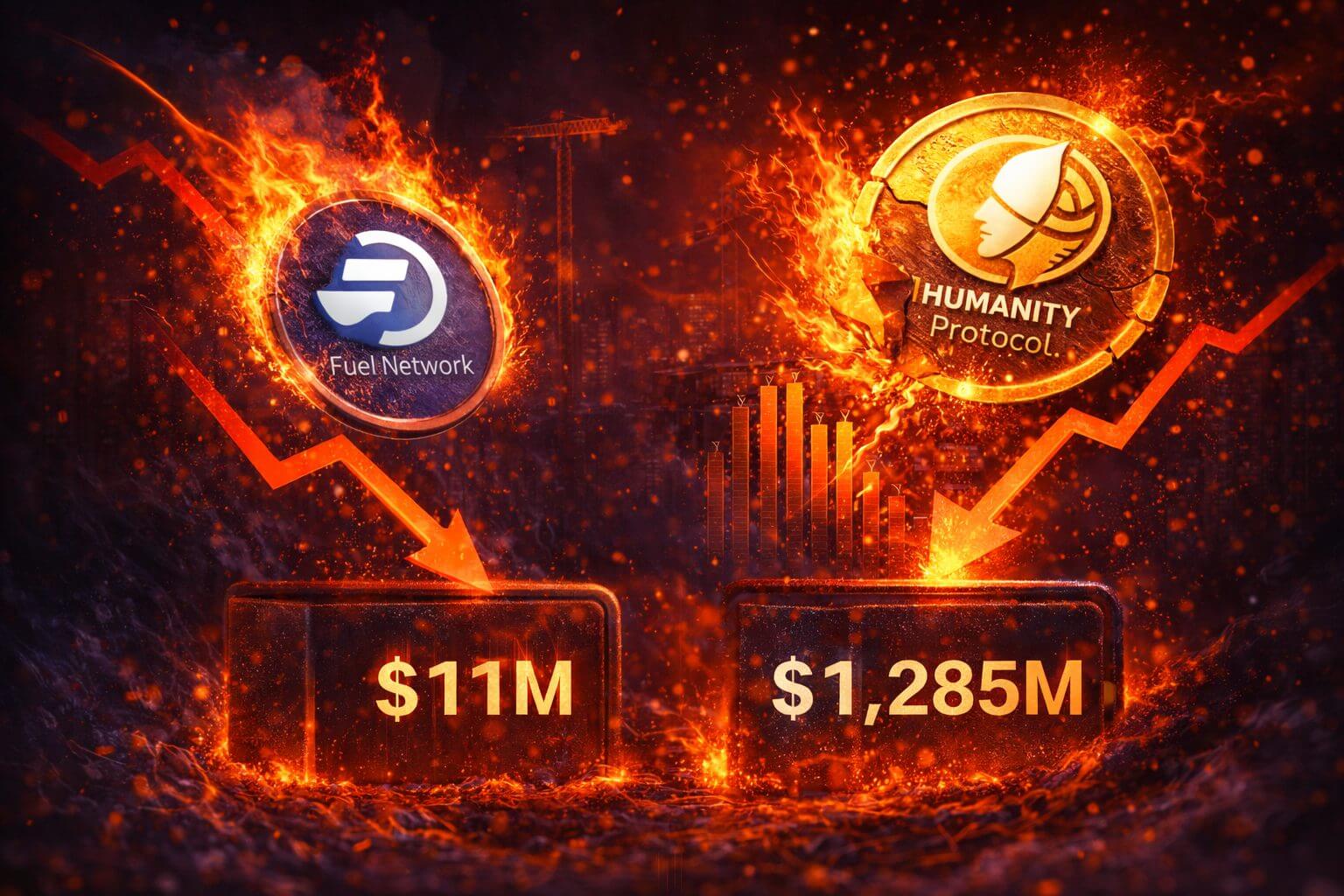 Zo kreeg Humanity Protocol bij de laatste investeringsronde een waardering van maar liefst $1 miljard mee, maar staat de huidige marktkapitalisatie op slechts $285 miljoen. En het wordt extremer: Fuel Network, ook gewaardeerd op $1 miljard, noteert nu een marktkap van slechts $11 miljoen. Een verschil van 98,9%.