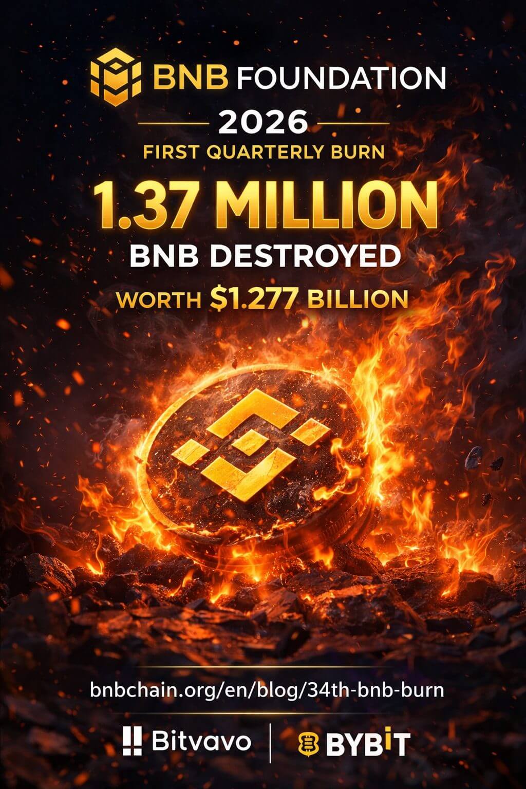Het jaar 2026 is voor BNB begonnen met een knal, want de BNB Foundation heeft de eerste kwartaal burn van het jaar afgerond. In totaal is er maar liefst 1,37 miljoen BNB vernietigd, goed voor een waarde van ongeveer $1,277 miljard. Het gaat om de 34e burn sinds de start van het programma, waarmee de circulerende supply van BNB nu is gedaald tot 136,36 miljoen tokens.