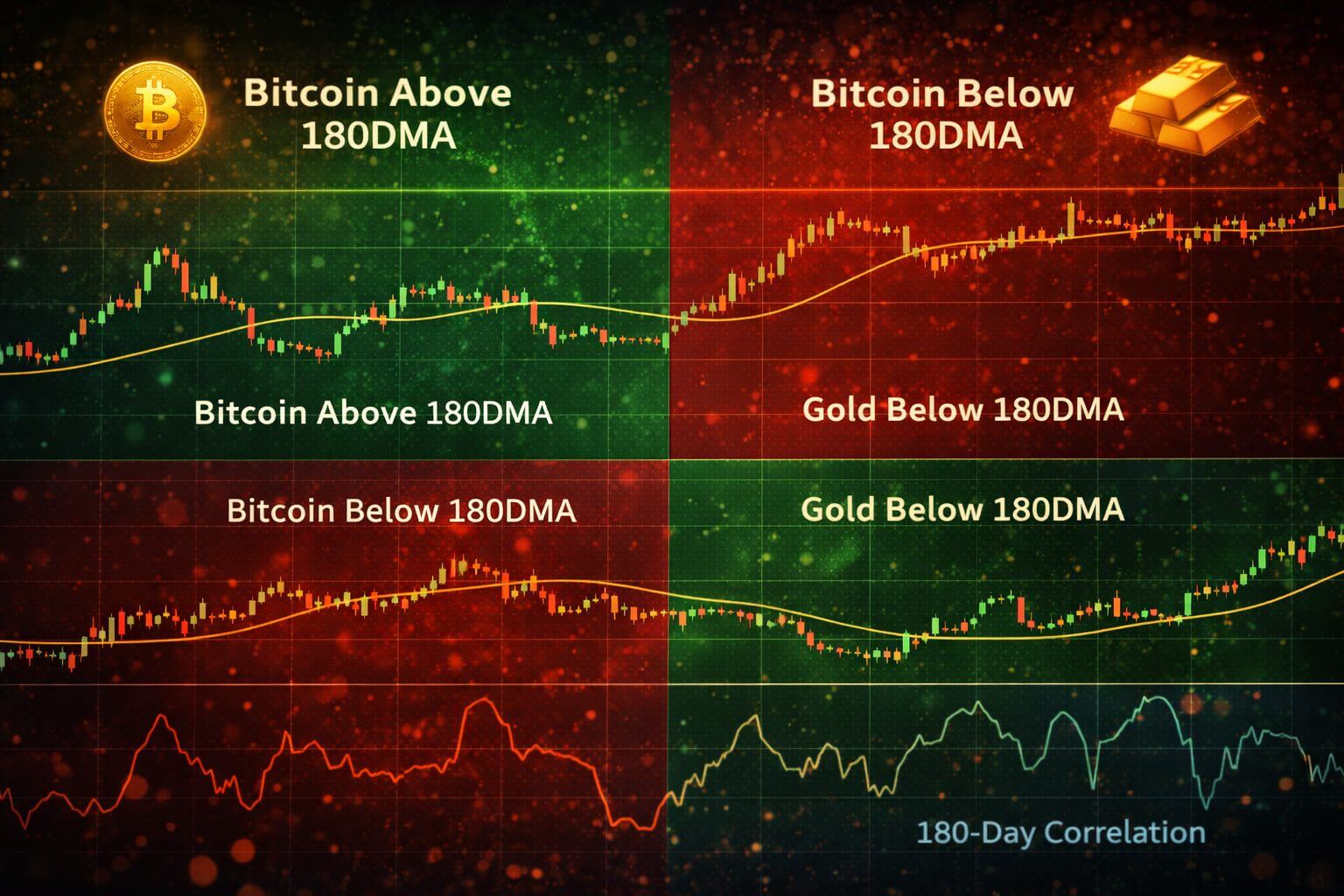 - Groen signaal: Bitcoin handelt boven zijn 180DMA, terwijl goud eronder zit.