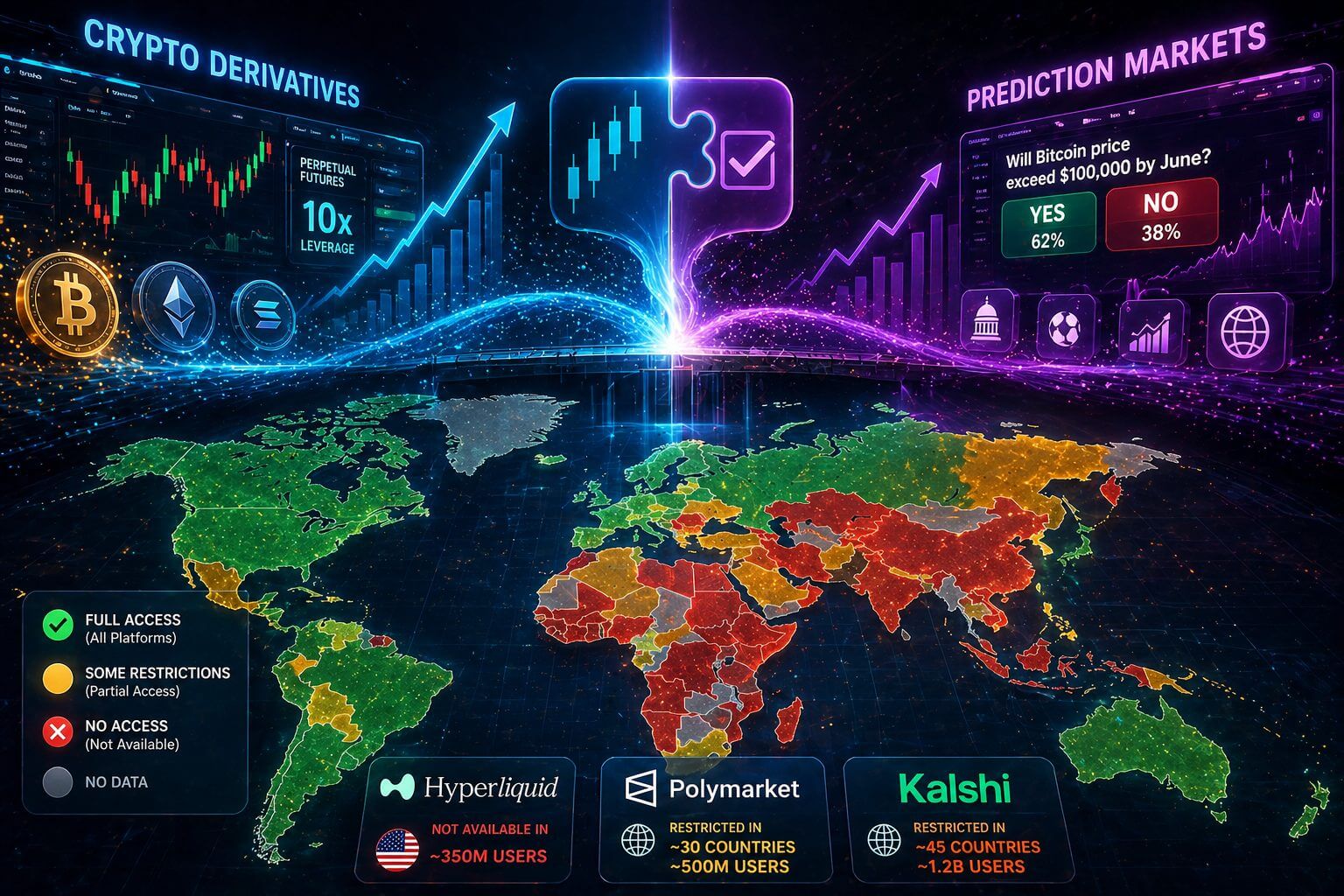 Hyperliquid is bijvoorbeeld niet beschikbaar in de Verenigde Staten, wat neerkomt op een enorme groep potentiรซle gebruikers van ongeveer 350 miljoen mensen. Polymarket mist toegang in zoโn 30 landen, goed voor ongeveer 500 miljoen gebruikers. Kalshi heeft de grootste beperkingen en is in circa 45 landen niet beschikbaar, wat neerkomt op een markt van meer dan 1,2 miljard mensen.
